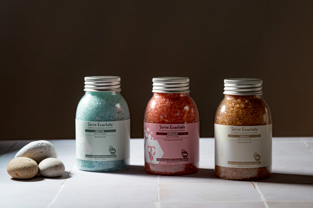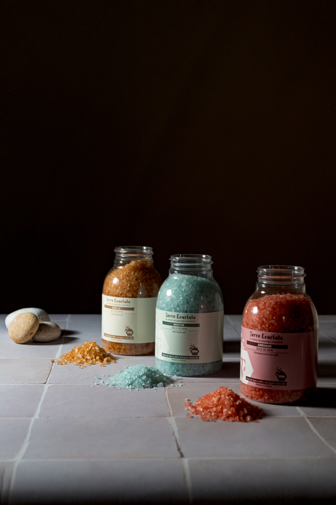 Pack de trois sels de bain : Menthe, Vanille, Grenade.